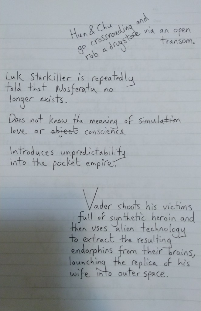 October 7, 2022October 19, 2024 Unnamed Sci-Fi Film // Anonymous +++ ++ + +++ ++ + +++ ++ + +++ ++ + +++ ++ + Anonymous has a cheap notepad and a child’s handwriting, knows little about Turkey but tried, walks daily, watched the Jellico ep of TNG last night, is moral. Share this: Click to share on X (Opens in new window) X Click to share on Facebook (Opens in new window) Facebook Like Loading... Related