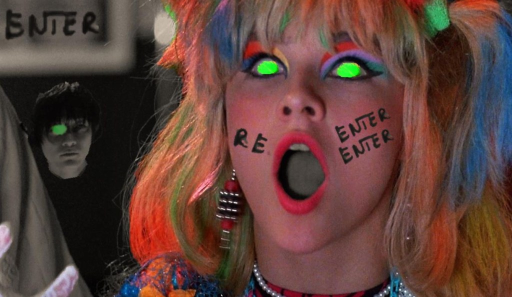 …the blonde girl, in a FUCK THE MUNICH MANUAL t-shirt, sits at a round table, staring at an empty bowl. To her left and right are two dark-haired women who look almost identical. They tell her it’s not the first time it’s happened, and if she doesn’t do something, Mum 6 will just keep doing it forever. The blonde girl picks up a green stick from the table and holds it up menacingly. She says inter-group fighting is not allowed, especially from early Mum iterations. The dark-haired woman to the right shakes her head, saying it was Mum 3 who was leading it. Before Mum 3 can respond, another dark-haired woman walks in, yawning, and opens the nearest cupboard. No cereal, she says, turning back to the table. The blonde girl [ plus Mums 2 and 3] glares back, her fingernail scraping the tip of the green stick.