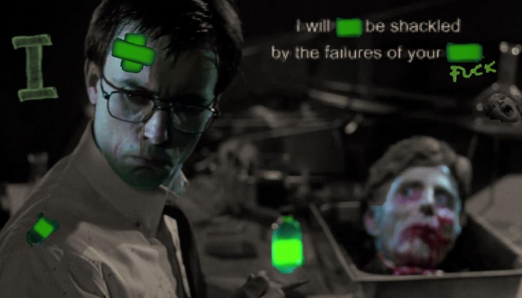 » Yes, exactly. This could explain my hybridity, > the body, a decaying vacuum that contained > a living virus that, every single moment, eats itself up > to revel in gross physicality > I was a yellow mantis-eye > I watched my self reanimate behind the slime green hex codes. All death is food >
