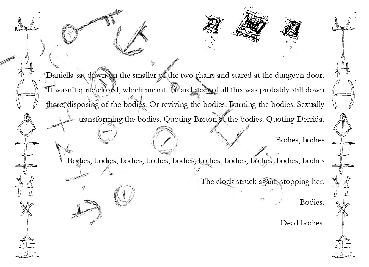 Medea da Carpi was responsible in some fashion or to some degree for the deaths of five lovers, which is recounted by Trepka drily at first and then later as a white knight, defending his new lust object on each count of murder, trying to mould her as subject within a fort of object-ness, not seeming to realise that truly understanding this woman as subject would lead to his own death too.