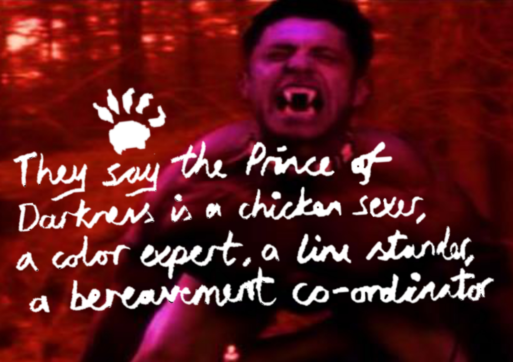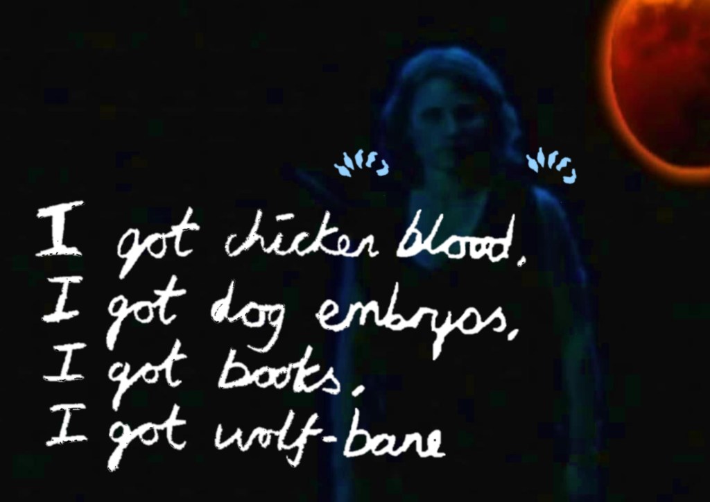 ‘Isn’t this better than the other thing?’ asks the silver werewolf to the pretend alcoholic surgeon and he can’t answer, he doesn’t know, won’t dare to dream of an artist who might be better than him.