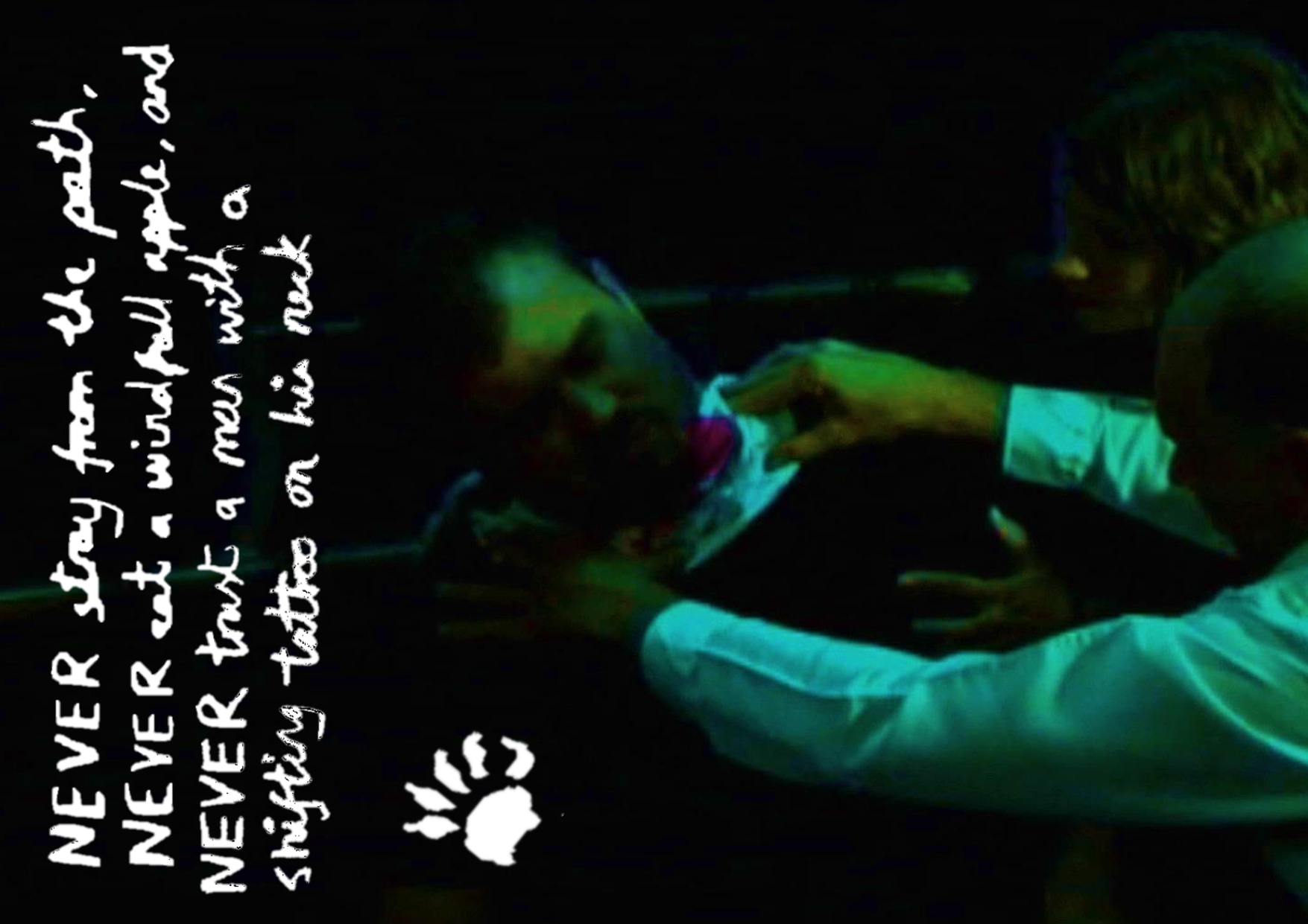 Meanwhile, somewhere over Oregon, a discoloured alcoholic werewolf and the cinematographer’s closet kid skid up figure eight dust clouds outside a scarred small town in short skirt that told its parents it was wearing a sleeping bag to Bryan Singer’s treehouse party that night and don’t wait up, I’m never coming back, not with these waves and waves of ex-military types pouring into my-