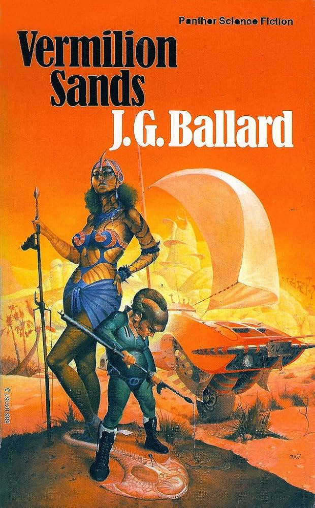 On the back, the blurb states: ‘Vermilion Sands is J.G. Ballard’s fantasy playground of the future – a latter-day Palm Springs. It is populated by forgotten movie queens and dilettantes dreaming up malicious games to relieve the boredom of a technocratic society.’